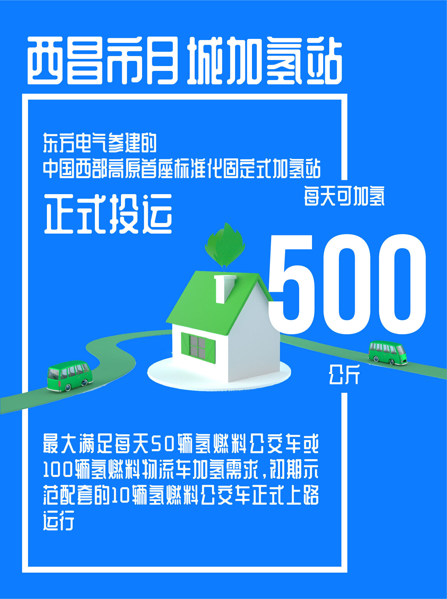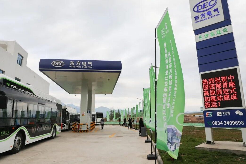 2021年6月2日,西昌市氢燃料电池汽车示范项目启动仪式在四川省西昌月城加氢站举行,标志着由东方电气参建的中国西部高原首座标准化固定式加氢站正式投运。该站每天可加氢500公斤,最大满足每天50辆氢燃料公交车或100辆氢燃料物流车加氢需求,初期示范配套的10辆氢燃料公交车正式上路运行。