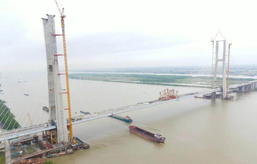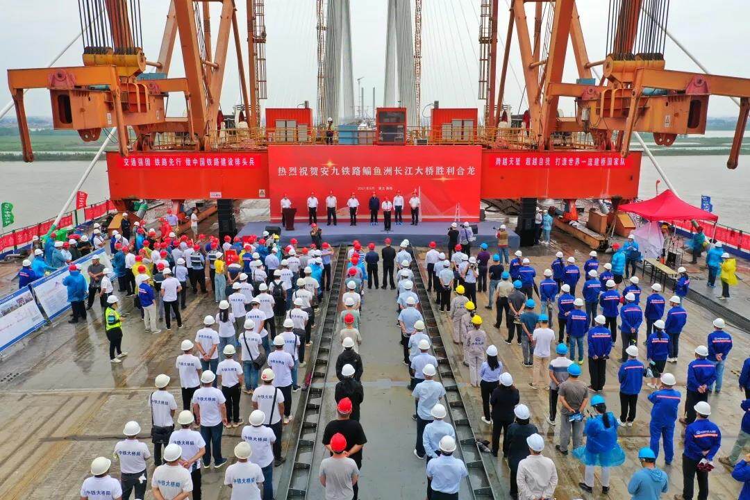 6月3日,由武九客专湖北公司建设,中铁大桥院设计,中铁大桥局施工的我国首座交叉索斜拉桥,世界跨度最大、运营速度最高的四线铁路钢箱混合梁斜拉桥---安九铁路鳊鱼洲长江大桥合龙。