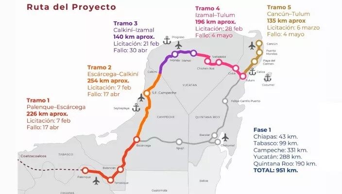 该设备预计将于2023年投入使用,届时1470公里的线路投入使用。它分五个部分建造。建成后,它将连接尤卡坦半岛的旅游目的地和人口中心。