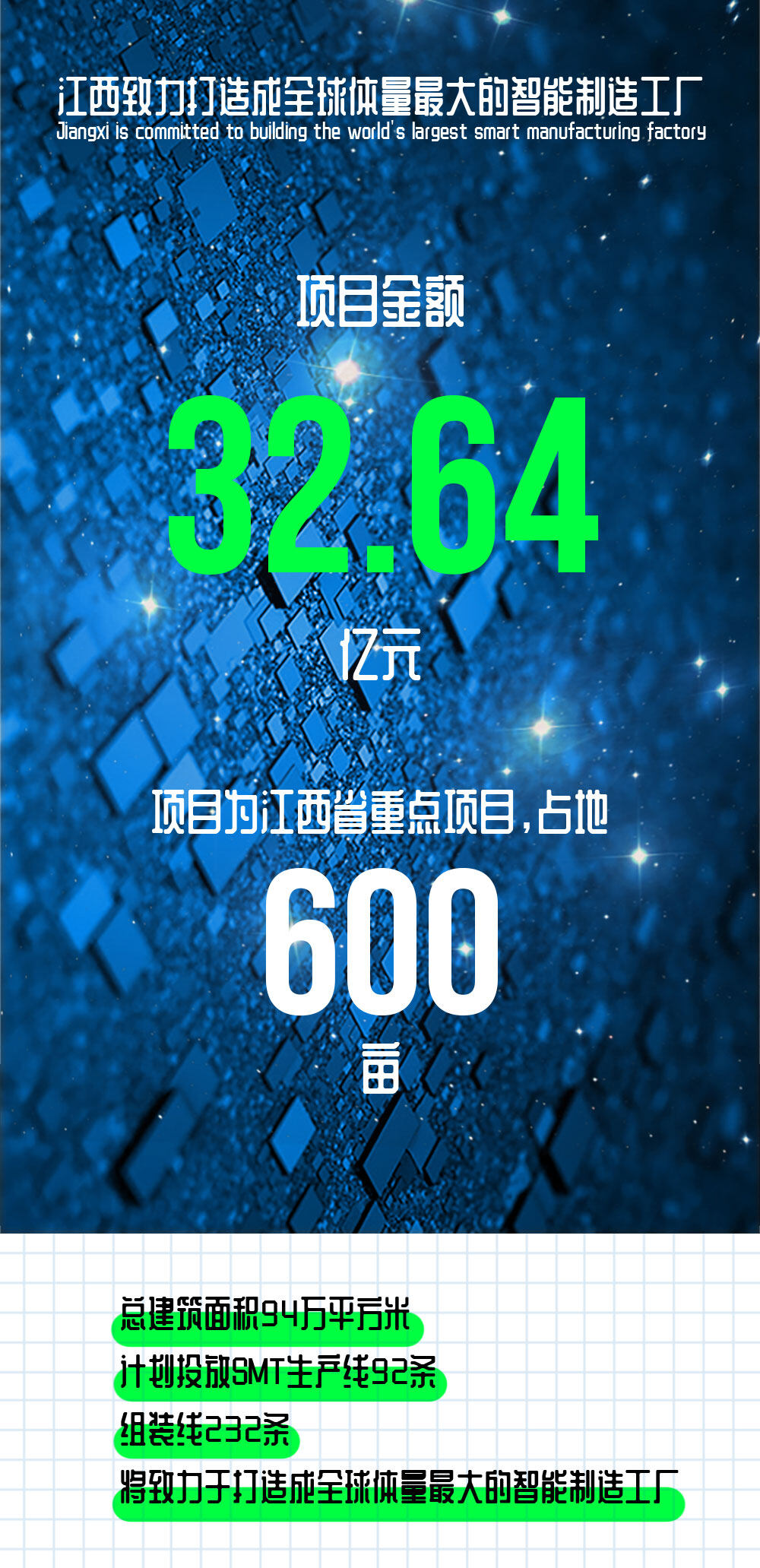 项目为江西省重点项目,占地600亩,总建筑面积94万平方米,计划投放SMT生产线92条,组装线232条,将致力于打造成全球体量最大的智能制造工厂。全部建成达产后,预计实现年产笔记本电脑、手机及其他智能终端产品1.2亿台,年主营业务收入或达1000亿元,将开创江西电子信息产业新纪元。