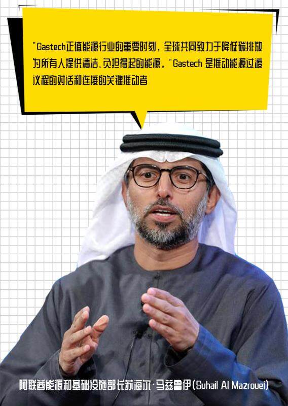 阿联酋能源和基础设施部长苏海尔•马兹鲁伊(Suhail Al Mazrouei)表示:"Gastech正值能源行业的重要时刻,全球共同致力于降低碳排放,为所有人提供清洁、负担得起的能源。"Gastech 是推动能源过渡议程的对话和连接的关键推动者。