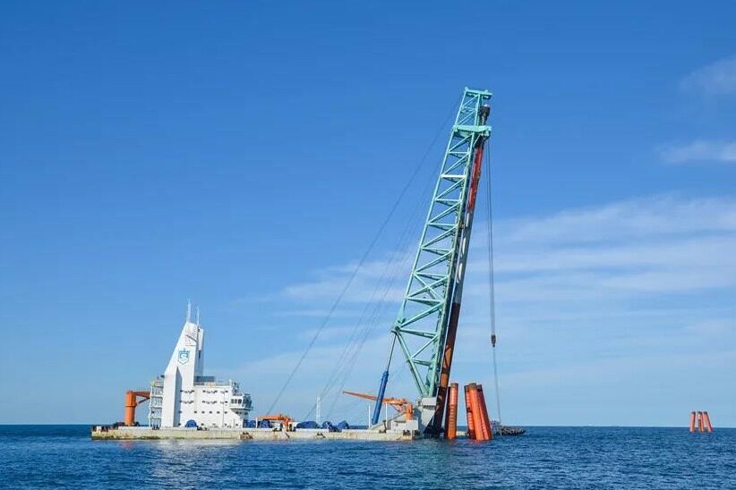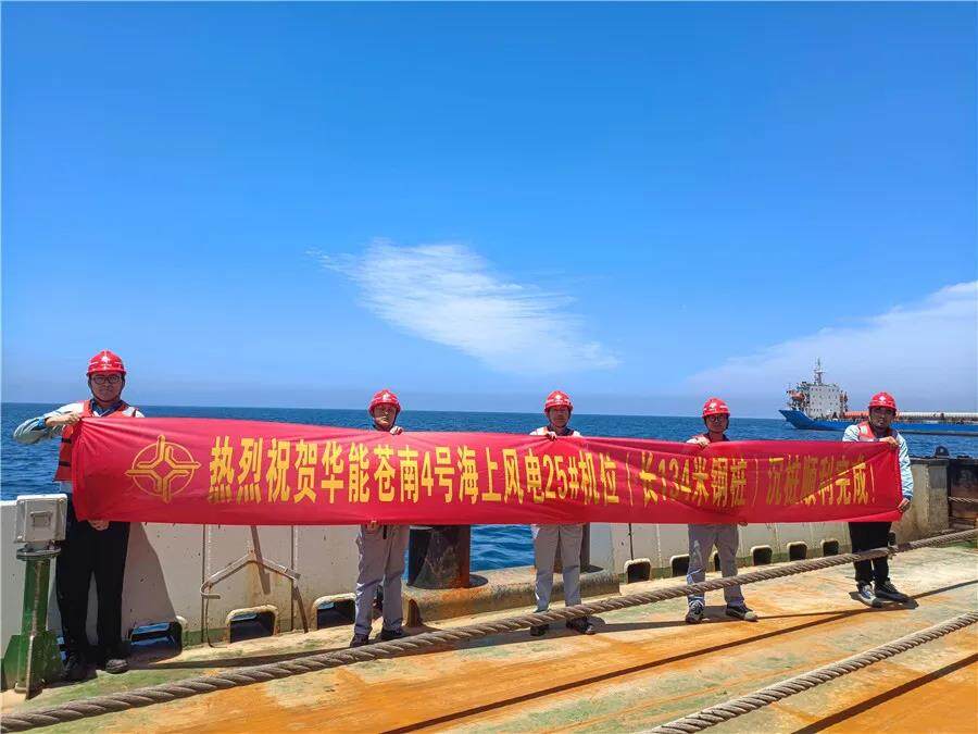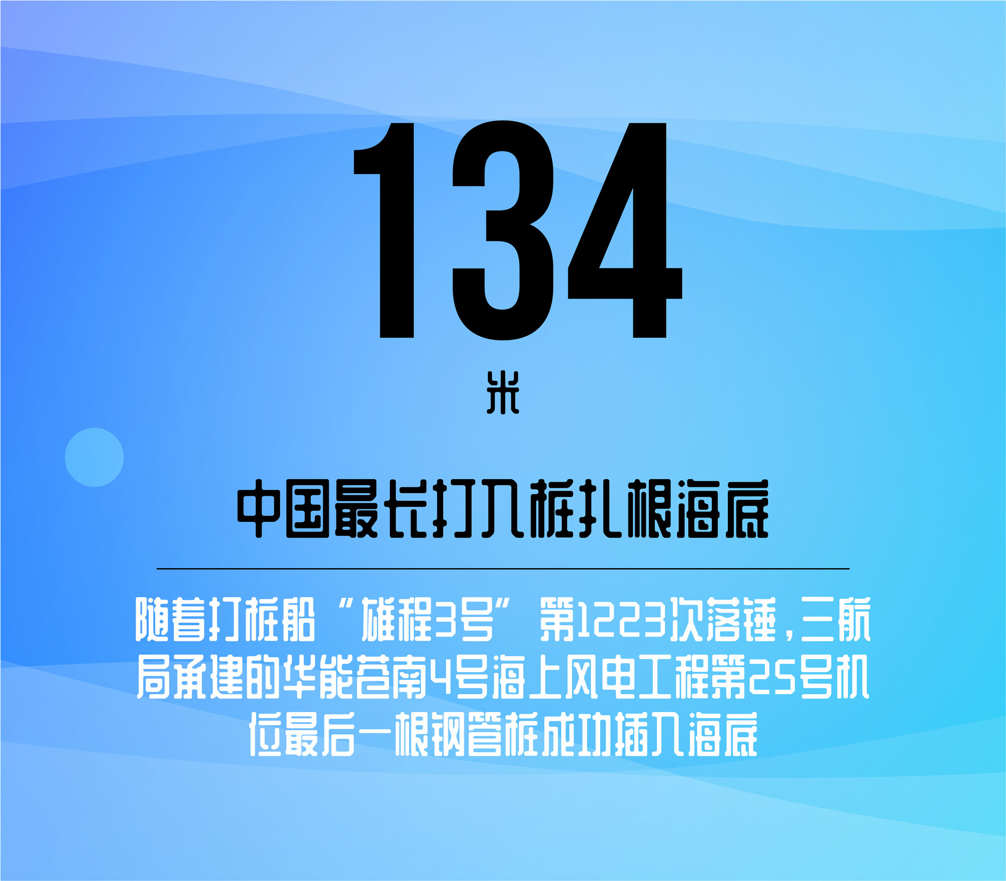 2021年6月6日,在风急浪涌的浙江省苍南县东部海域上,随着打桩船“雄程3号”第1223次落锤,三航局承建的华能苍南4号海上风电工程第25号机位最后一根钢管桩成功插入海底。