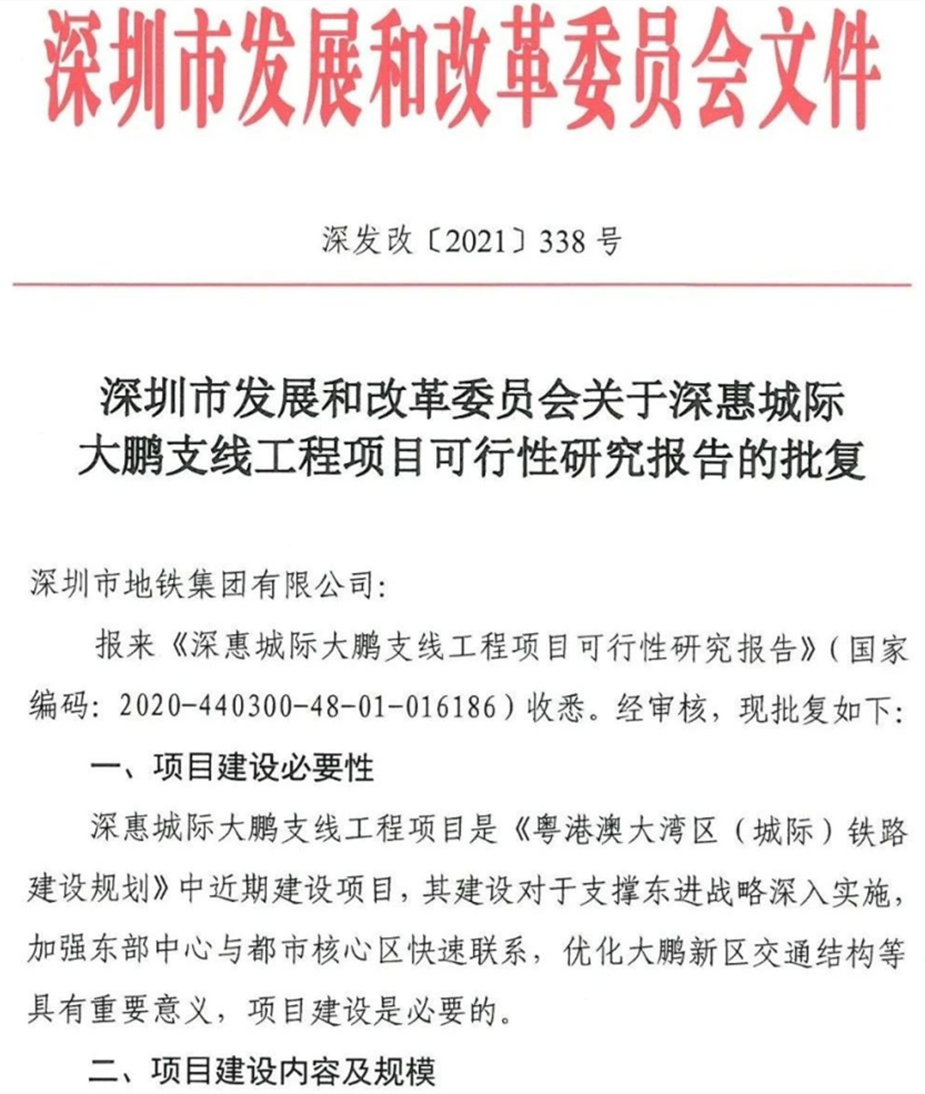 The Shenzhen-Huizhou Intercity Dapeng Branch mainly passes through Longgang Central Area, Pingshan Central Area, Yanzi Lake Area, Kuiyong Central Area, Dapeng and Xinda Area. The total length of the line is 39.4 kilometers, the design speed is 160 kilometers per hour, and the total project investment is 23.62 billion yuan.