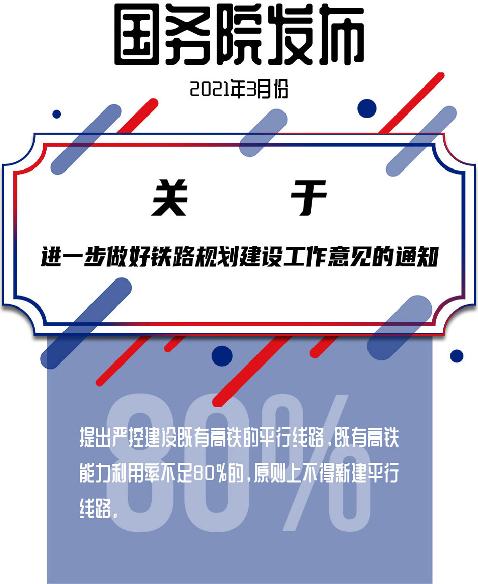 2021年3月份国务院发布《关于进一步做好铁路规划建设工作意见的通知》(下称《意见》),提出严控建设既有高铁的平行线路,既有高铁能力利用率不足80%的,原则上不得新建平行线路。