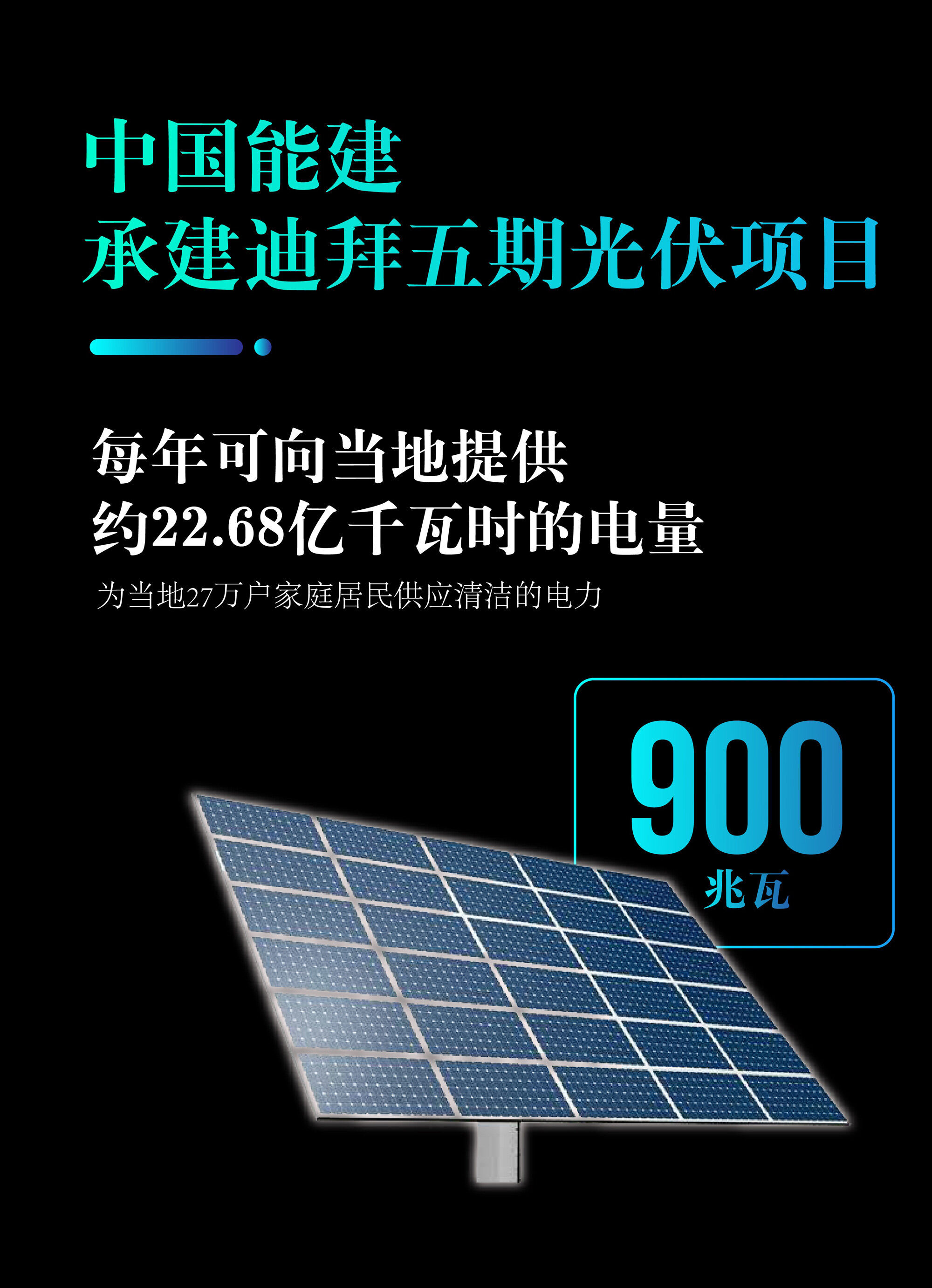 工程建成后,按照900兆瓦光伏(太阳能电池组件共261.3万块)计算,每年可向当地提供约22.68亿千瓦时的电量,为迪拜建设清洁能源提国供了强大的“绿色”电源,为当地27万户家庭居民供应清洁的电力。