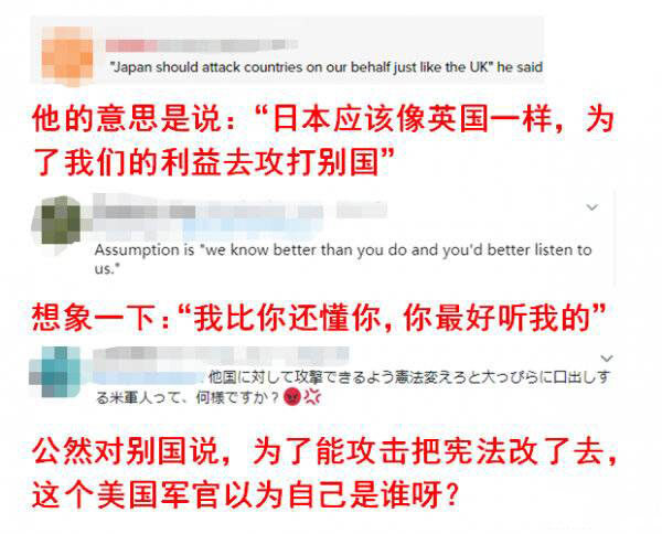 在一番“关心”日本安危的说辞下,他还不忘抱怨日本对驻日美军训练的限制太严格。舆论对这名军官的话不乏批评声音,也有日本网友难掩愤怒地回怼:你以为自己是谁?或许由于此番对日喊话姿态过于居高临下,就连美国国内专家也忍不住表示反感。