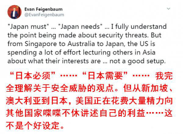 美国前国务院亚太事务高级官员、卡内基国际和平基金会的埃文·费根鲍姆在社交网站上批评美国对盟友指手画脚。但来自各界的质疑,并没有浇灭美国部分人士指手画脚的热情。比如,斯坦福大学胡佛研究所的美国学者迈克尔·奥斯林在接受采访时告诫日本:面对中国等国的威胁,日本应当增强自卫队能力。