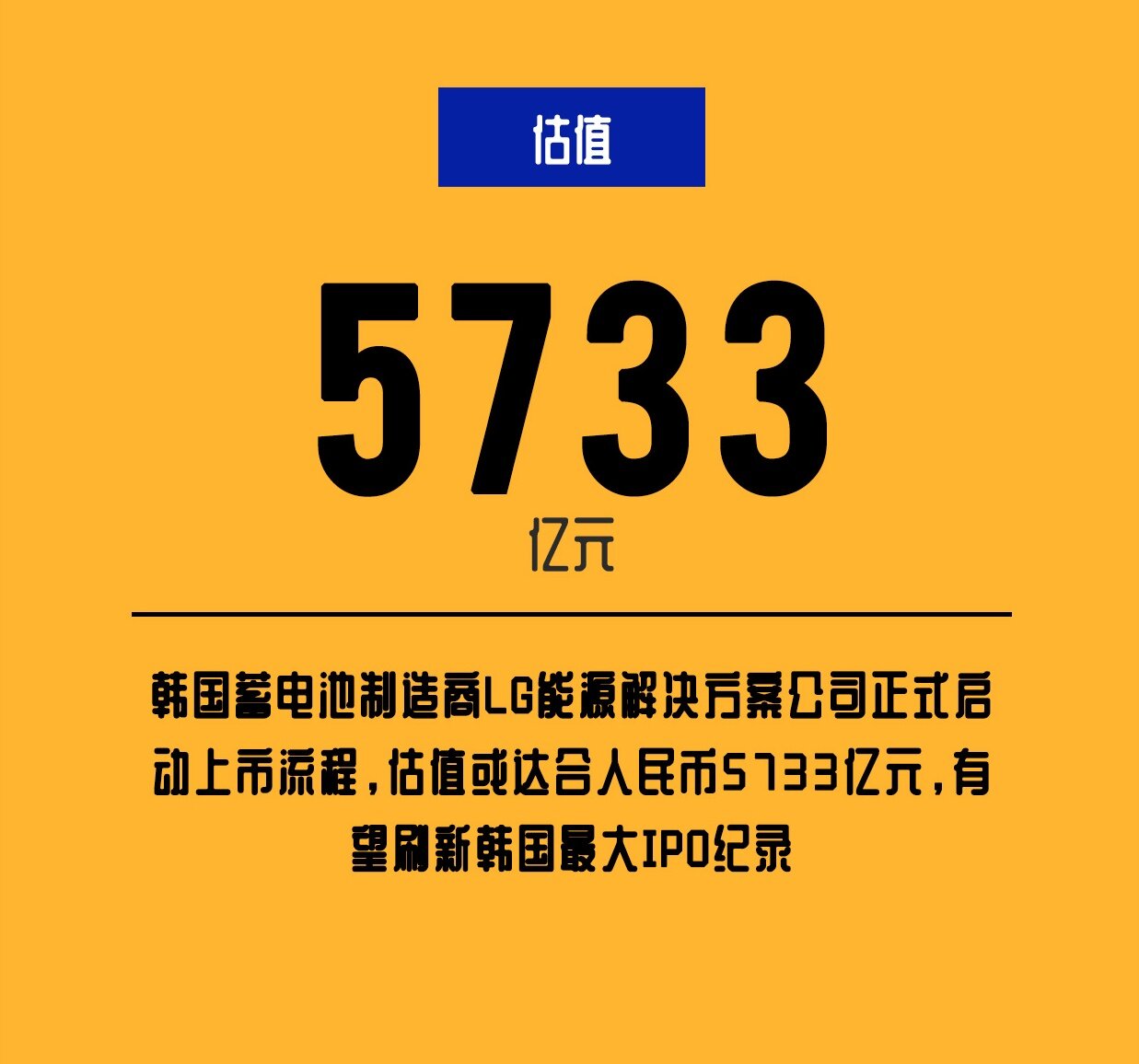 韩国蓄电池制造商LG能源解决方案公司(LG Energy Solution Ltd。,下称“LG新能源”)正式启动上市流程,估值或达100万亿韩元(约合人民币5733亿元),有望刷新韩国最大IPO纪录。计划在今年下半年上市的韩国企业中,至少有10家公司估值超1万亿韩元,预计今年韩国新股发行规模创历史新高。6月8日,据韩国投资银行业界消息,LG新能源当天向韩国交易所申请了有价证券市场上市预备审查。预计于今年第三季度上市,募资规模或超10万亿韩元(约合人民币573亿元)。