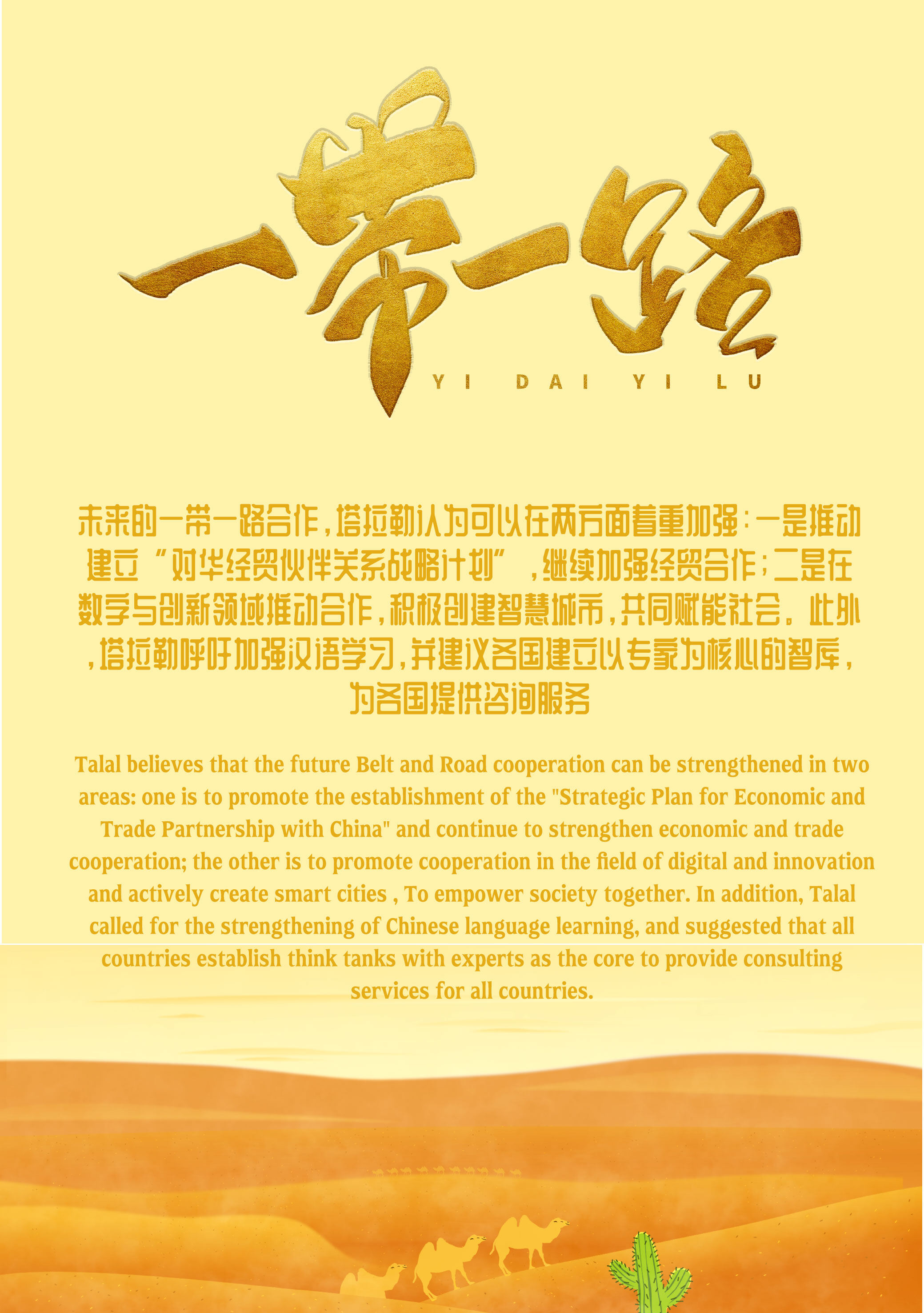 对于未来的一带一路合作,塔拉勒认为可以在两方面着重加强:一是推动建立“对华经贸伙伴关系战略计划”,继续加强经贸合作;二是在数字与创新领域推动合作,积极创建智慧城市,共同赋能社会。此外,塔拉勒呼吁加强汉语学习,并建议各国建立以专家为核心的智库,为各国提供咨询服务。
