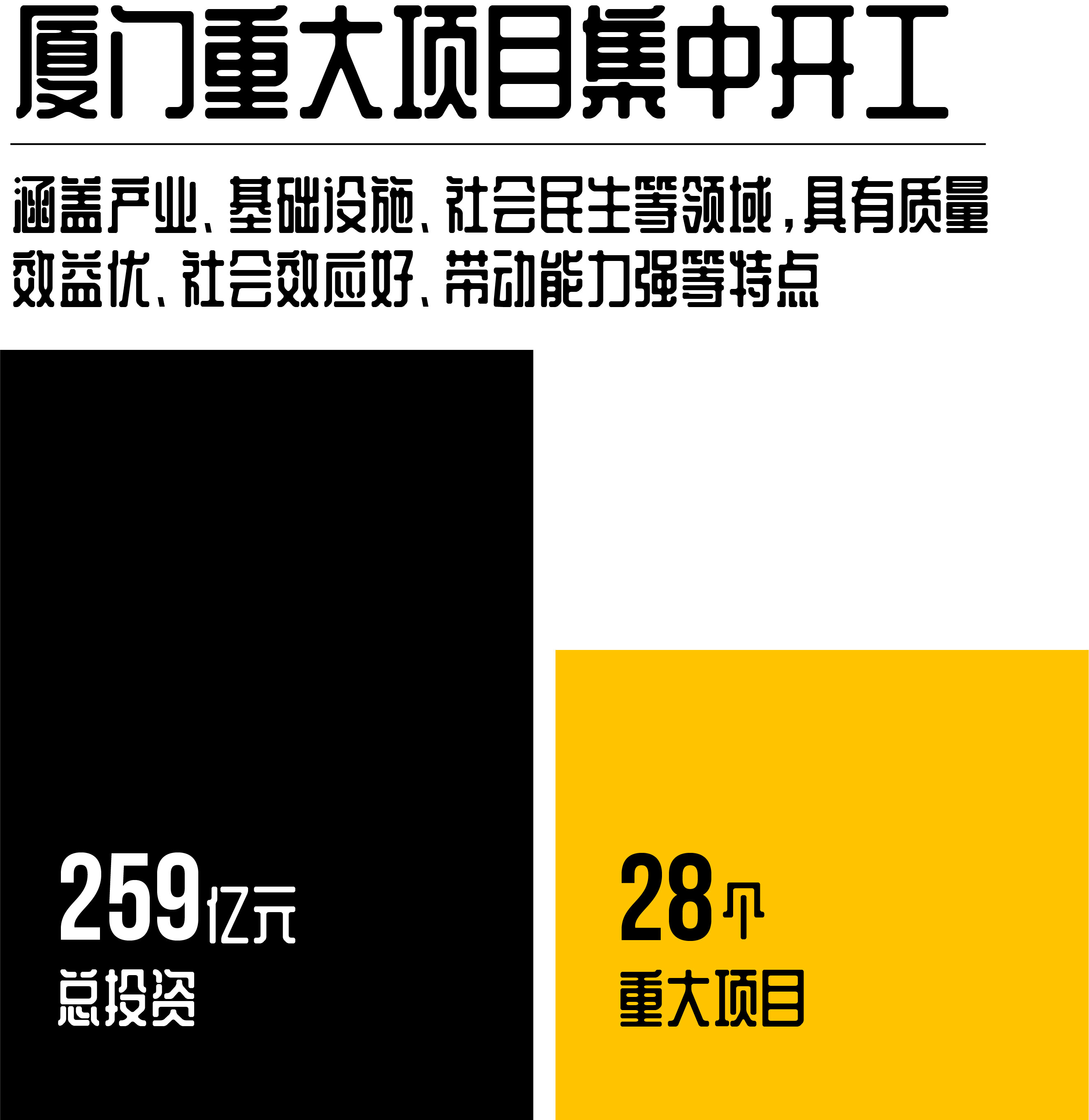 2021年6月7日,福建省举行第二季度重大项目视频连线集中开工活动,厦门市有28个项目,总投资259亿元,涵盖产业、基础设施、社会民生等领域,其中,产业类项目13个,总投资约142亿元,年度计划投资约23亿元;基础设施类项目10个,总投资约65亿元,年度计划投资约17亿元;社会事业类项目5个,总投资约52亿元,年度计划投资约4亿元。