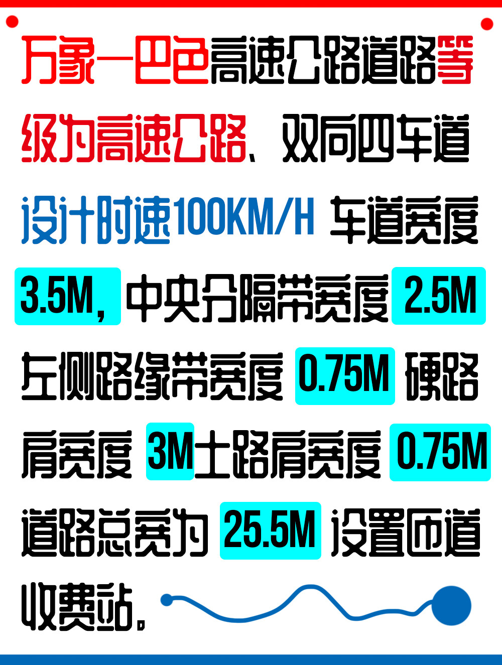 据河南省交通规划设计研究院股份有限公司此前消息,万象—巴色高速公路道路等级为高速公路、双向四车道、设计时速100km/h,车道宽度3.5m,中央分隔带宽度2.5m,左侧路缘带宽度0.75m,硬路肩宽度3m,土路肩宽度0.75m,道路总宽为25.5m,设置匝道收费站。