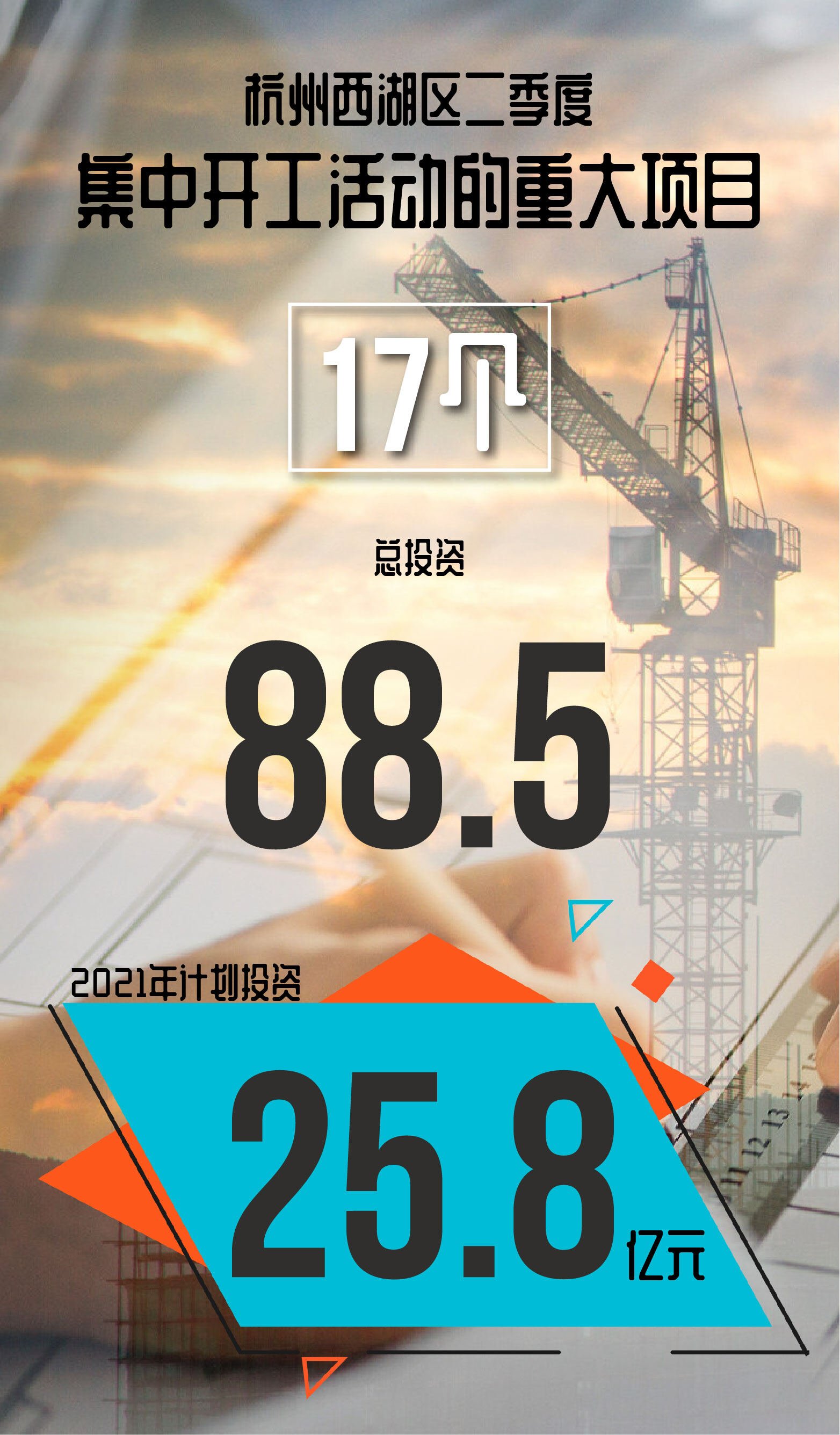 2021年6月15日,杭州市西湖区在西湖体育馆复建项目现场举行第二季度17个重大项目集中开工活动。据了解,开工现场集中开工项目共17个,范围涵盖产业发展项目5个、民生事业项目3个、基础设施项目9个,总投资88.5亿元,年度计划投资25.8亿元。