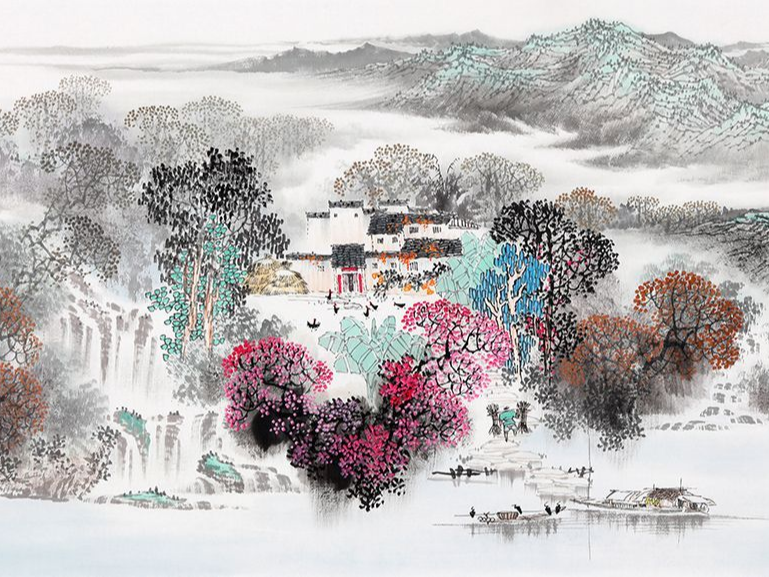 元代山水画趋向写意,以虚带实,侧重笔墨神韵,开创新风;明清及近代,续有发展,亦出新貌。表现上讲究经营位置和表达意境。传统分法有水墨、青绿、金碧、没骨、浅绛、淡彩等形式。