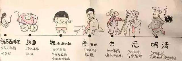 العصر الحجري الحديث: ولادة حياة جديدة. أساسا على أساس حوض نمط الرقص. في فترة الدول المتحاربة: وُلد الطفل ، ويمثله أقرب شخصياته "تنين الشخصيات وفينيكس" ؛ ووي جين السلالات الجنوبية والشمالية: فترة نمو شخصية الطفل ، ممثلة بـ "لوه شين فو تو" في عهد أسرة جين الشرقية ؛ وسلالات تانغ والخمسة: مهنة ناجحة رجل ناضج ، فترة الذروة للرسم ، ويمثلها "هان شي زي ليلي وليمة" قو تانغ تشونغ في عهد أسرة تانغ الجنوبية ؛ أسرة سونغ: المتقاعدون ، هذه الفترة تولي الانتباه إلى المناظر الطبيعية للزهور والطيور ، وغالباً ما تكون الشخصيات بمثابة وجهة نظر في الجبال ؛ : كبار السن الذين يعانون من المرض ، تطورت لوحات المناظر الطبيعية في هذه الفترة بشكل جيد للغاية ، واستمرت أهمية لوحات الأشكال في الانخفاض ؛ أسرة مينغ وتشينغ: وجدت هواياتهم الخاصة في سنواتهم اللاحقة ، والأشخاص الأكثر حيوية ورائعة ، واللوحات الشخصية لهذه الفترة تعد الأنماط أكثر تنوعًا ، كما أن الجمع بين الأنماط الصينية والغربية مثير للغاية ، على سبيل المثال ، "خريطة قراءة التنفس الربيعية" الصادرة عن أسرة تشينغ.