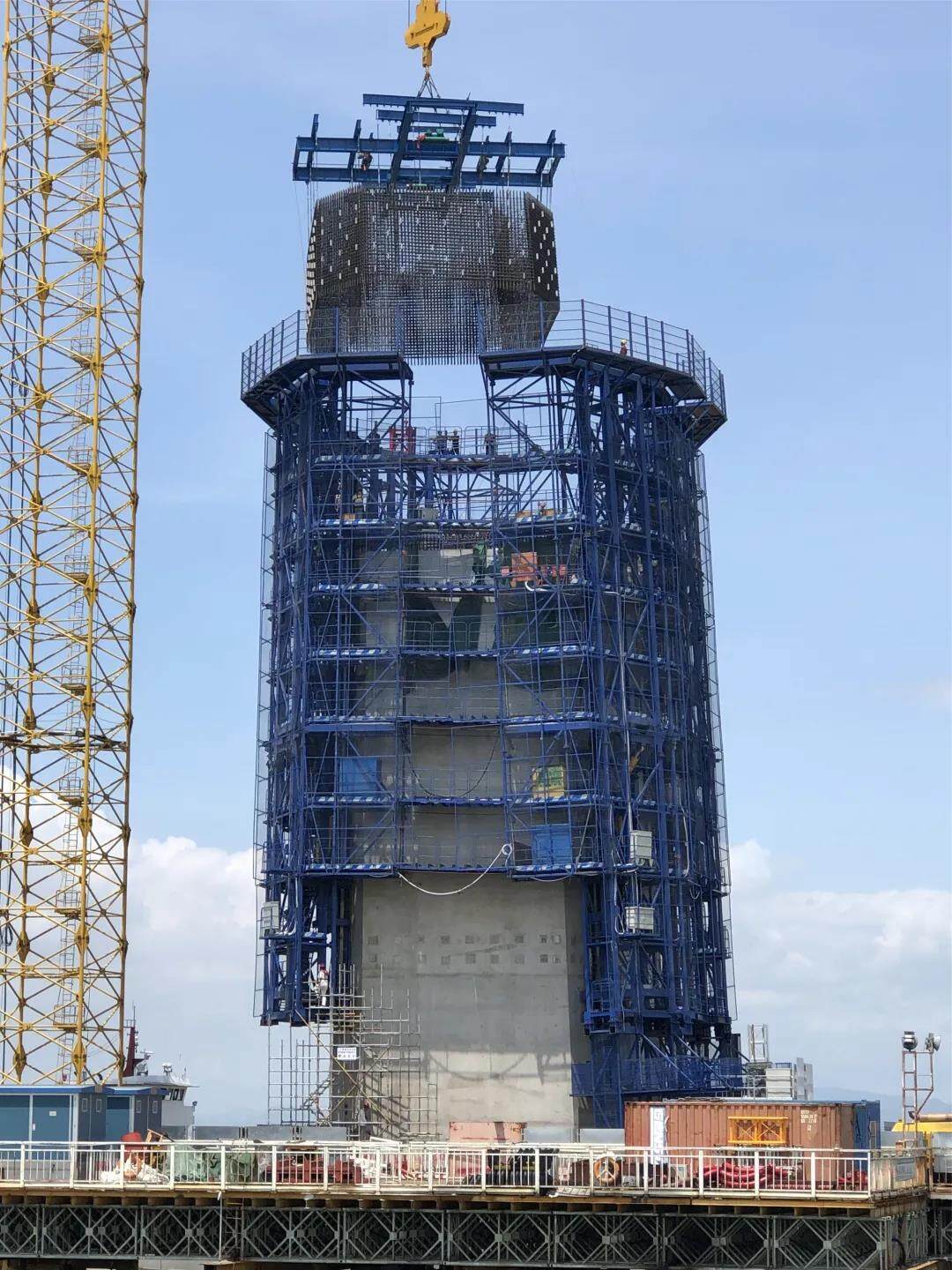 东索塔塔柱施工共分48次浇筑,混凝土总量约5万立方米,钢筋用量达7400吨,相当于1座埃菲尔铁塔的用钢量。塔柱钢筋采用直径40毫米和32毫米的主筋,塔柱断面为八边形截面,随着高度爬升不断收分变化,对每个部品钢筋整体近千个钢筋接头对接的精度控制带来巨大挑战。