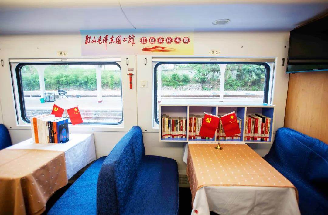 在韶山至井冈山红色专列上,开设有韶山毛泽东图书馆红色文化书屋,陈列有许多书籍可供乘客翻阅。