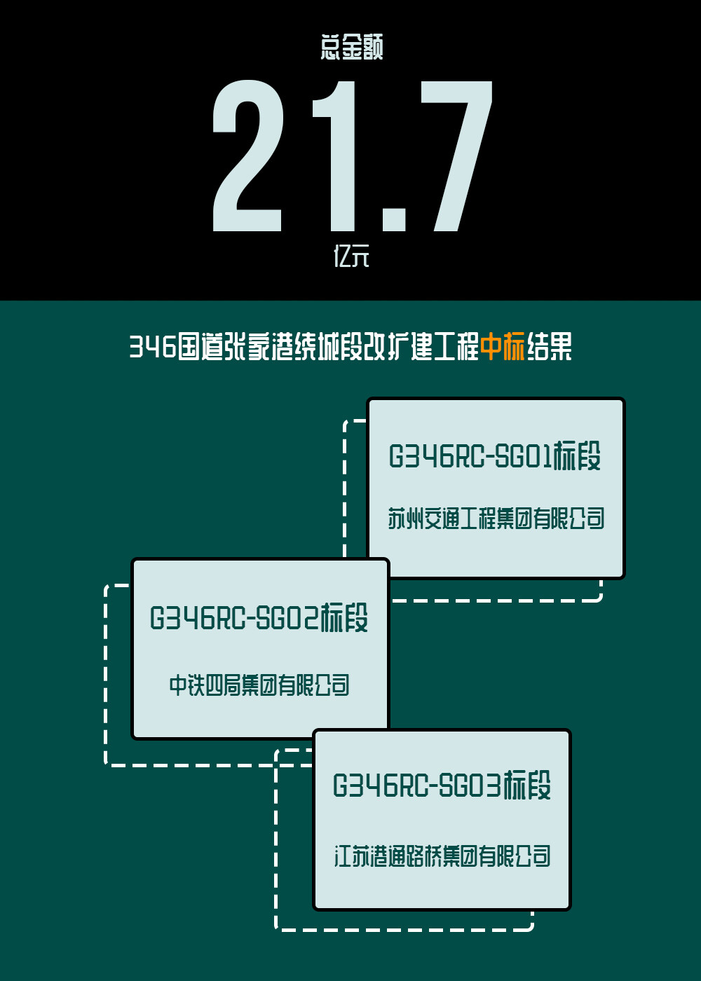 苏州交通工程集团有限公司中标G346RC-SG01标段(K0+000--K2+280):本标段全线按双向六车道一级公路标准进行新建,设计速度80公里/小时,一般路段路基宽度33米。本标段主要工点包括鹿苑枢纽互通、三干河大桥。总投资6.6亿元。
