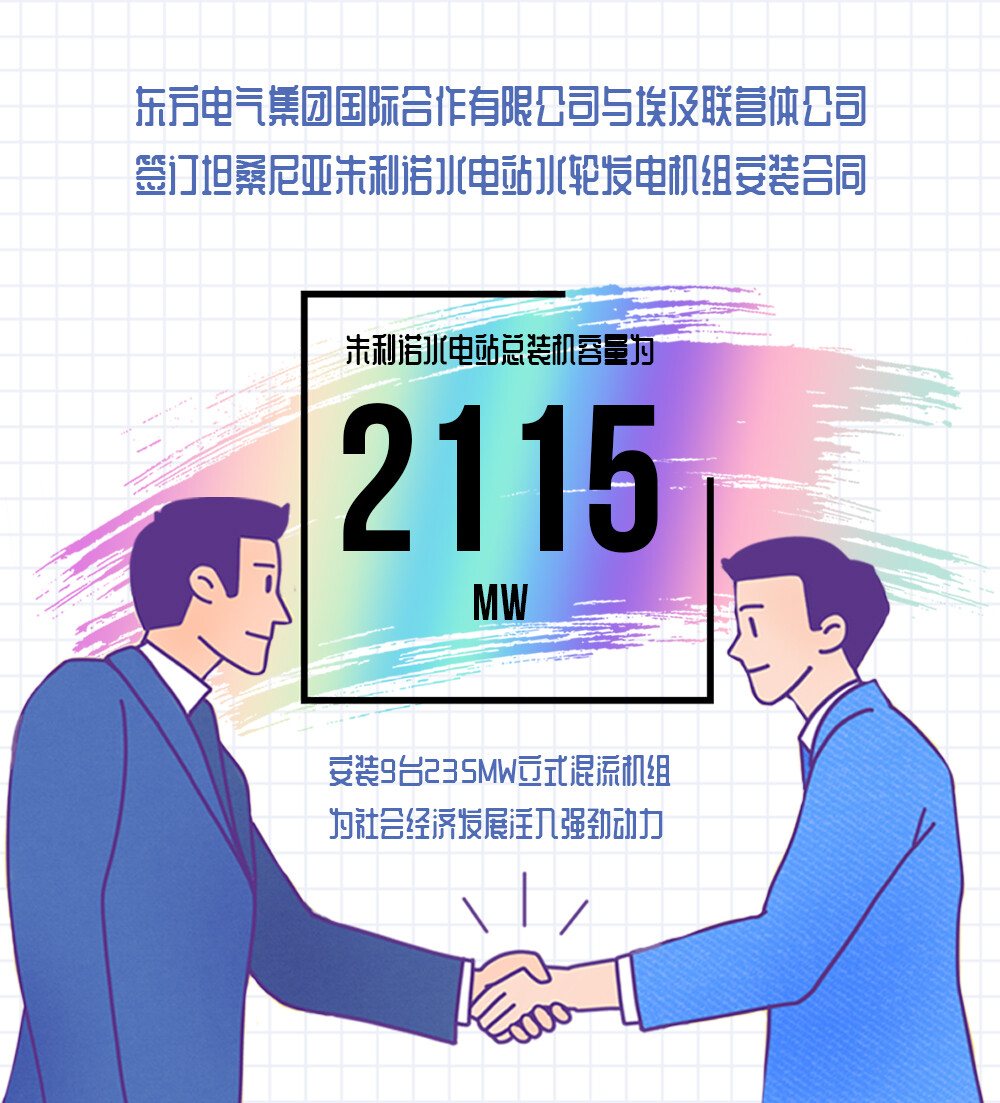 朱利诺水电站总装机容量为2115MW,安装9台235MW立式混流机组,此前,东方电气集团国际合作有限公司和埃及联营体公司签订包括9台水能发电机组在内的主设备供货合同。该项目建成后,将大大改善坦桑尼亚电力供应状况,降低用电成本,为社会经济发展注入强劲动力。