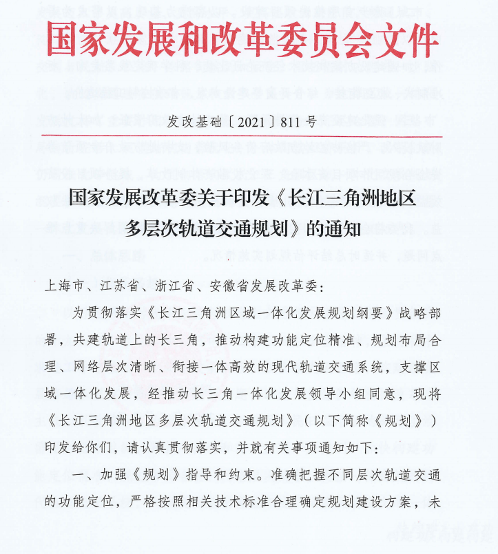 建设交通强国已成为中国未来交通运输发展的重点目标。铁路建设规划综合消息:近日,国家发改委正式印发《长江三角洲地区多层次轨道交通规划》(发改基础[2021]811号)。