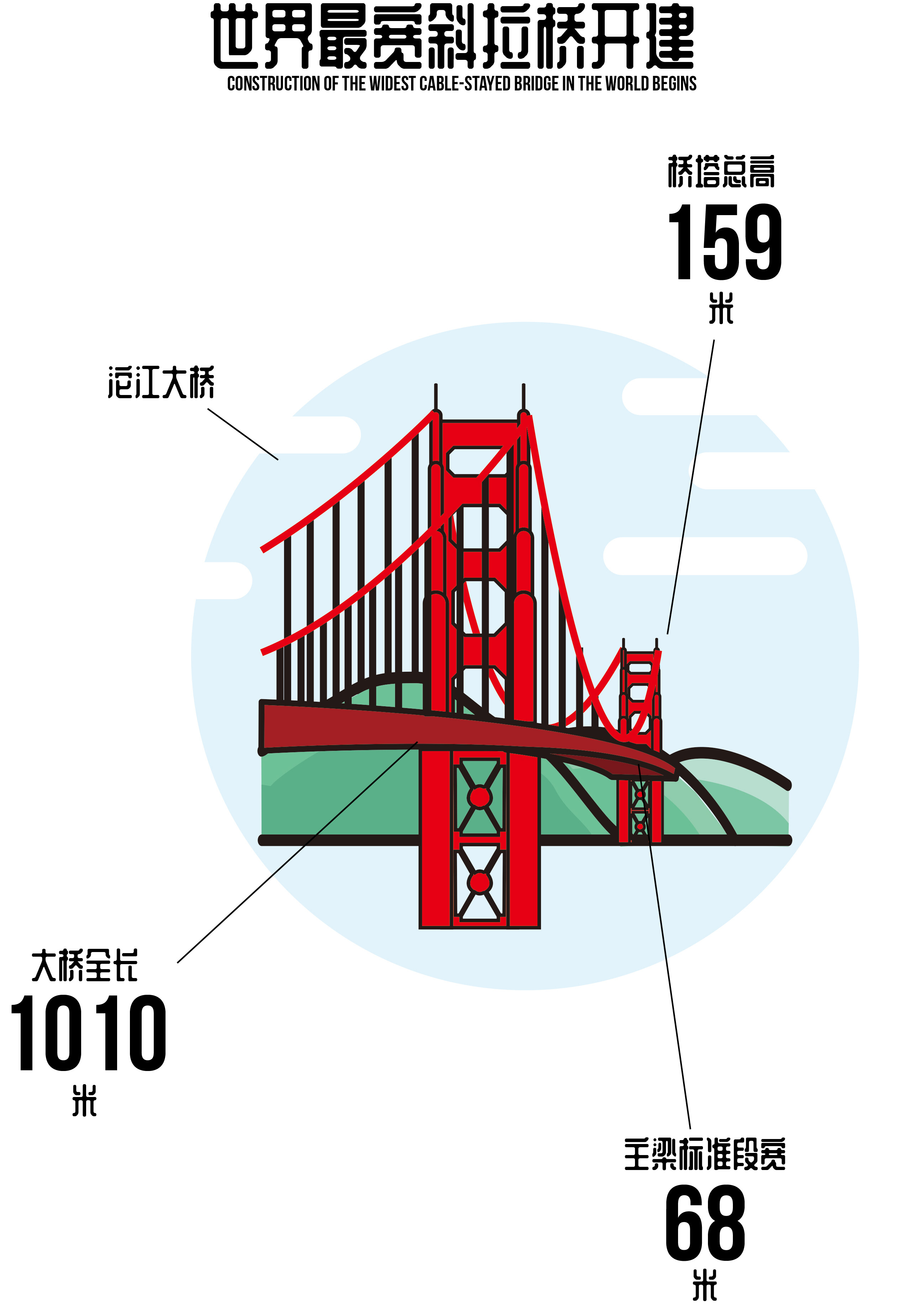 2021年6月13日,由中国铁建集团大桥局勘察、设计、施工总承包的世界最宽斜拉桥——成都东西城市轴线沱江大桥主墩首根桩基础工程灌注完成,标志着该桥进入实质性施工阶段。