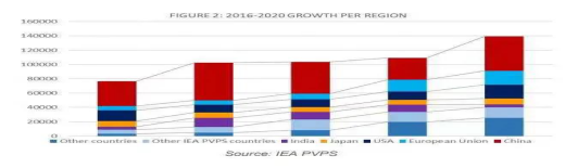 在全球光伏装机中有14个国家的累计装机容量超过10GW,有5个国家的累计装机容量超过40GW。排名前四中国、欧盟、美国、日本累计光伏装机总共分别为254.4GW、151.3GW、93.2GW、71.4GW。由上图可知,中国,越南,是光伏市场主要增加的国家。欧盟、美国的光伏市场也有少量增幅。但是印度的光伏市场出现了主要下滑。总的来说,新冠病毒对于2020年市场发展没有显著影响。虽然在Q1期间,为防治新冠采取封锁措施导致了一些项目延迟,随着对于新冠疫情防控措施有效实行,陆续的复工复产,大部分国家在Q3、Q4已经恢复正常。