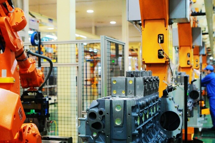 绿地面、棕过道,黑色的发动机缸体在工位间穿梭。工位上忙碌着的,有身着蓝工装的工人,更有白色、红色的机器人。2018年以来,这条生产线不断进行着智能化升级。