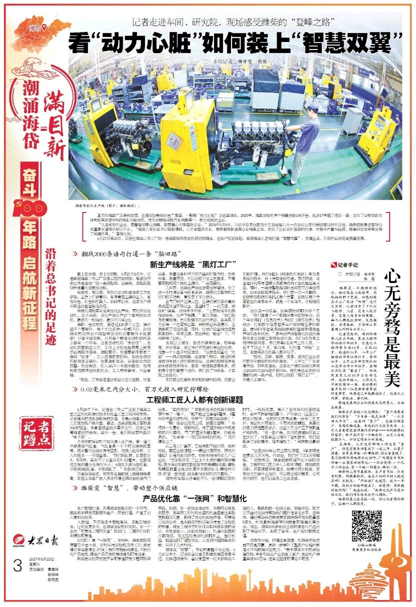 5月27日至29日,记者在潍柴二号工厂的一条装配线和发动机研究院蹲点,在生产现场体验、感受潍柴人怎样打造“智慧双翼”,支撑企业、引领行业实现高质量发展。
