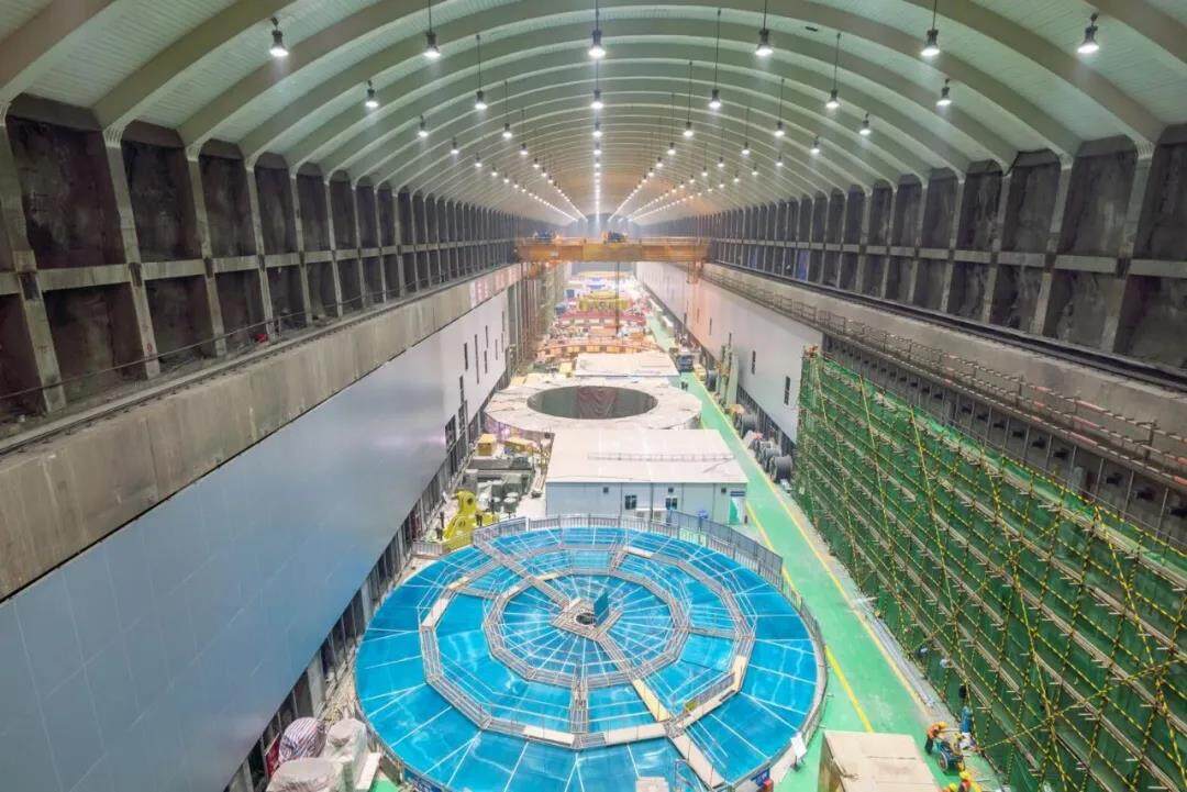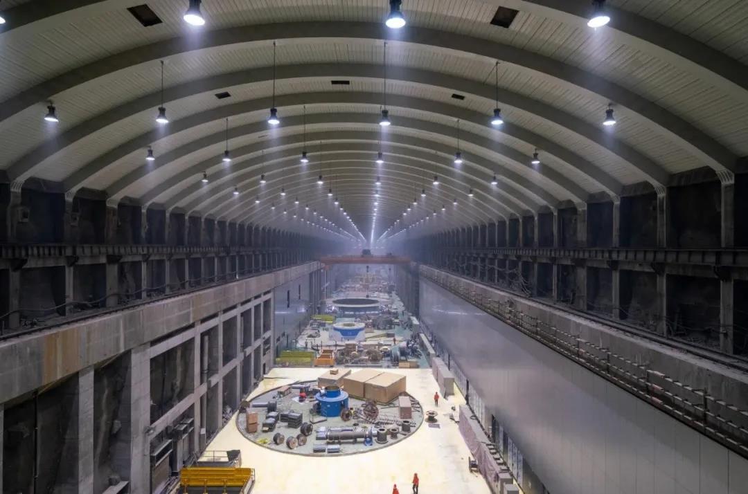 深V型峡谷空间有限,因此,白鹤滩水电站整个引水发电系统的设备都被安置在两侧山体内专门开挖的地下洞室中。分别安装着8台百万千瓦水电机组的两岸地下厂房,每一个的长度就有438米,顶拱跨度超过34米,高度88.7米,是目前世界上最大的地下厂房。另外,左右岸还共有8个圆筒式尾水调压室,直径42~48米,也是世界上已建跨度最大的调压室。