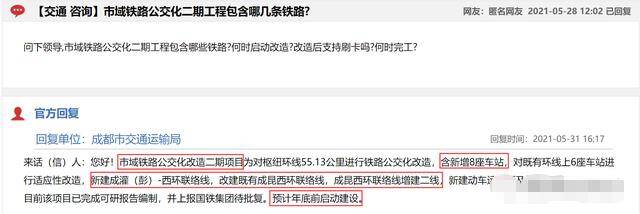 根据成都市交通运输局回复,市域铁路公交化改造二期项目为对枢纽环线55.13公里进行铁路公交化改造,含新增8座车站,对既有环线上6座车站进行适应性改造,新建成灌(彭)-西环联络线,改建既有成昆西环联络线,成昆西环联络线增建二线,新建动车运用所及相关工程。目前该项目已完成可研报告编制,并上报国铁集团待批复。预计年底前启动建设。