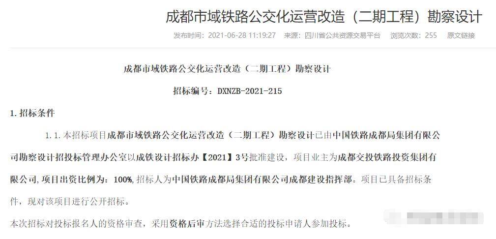 2021年6月28日,《成都市域铁路公交化运营改造(二期工程)勘察设计招标公告》(招标编号:DXNZB-2021-215)发布。