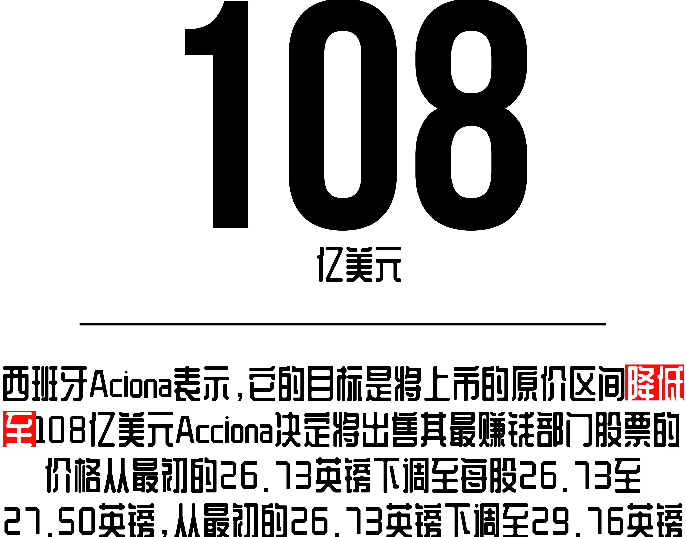 西班牙Aciona表示,它的目标是将上市的原价区间降低至90.5亿欧元($108亿美元)。Acciona决定将出售其最赚钱部门股票的价格从最初的26.73英镑下调至每股26.73至27.50英镑,从最初的26.73英镑下调至29.76英镑。