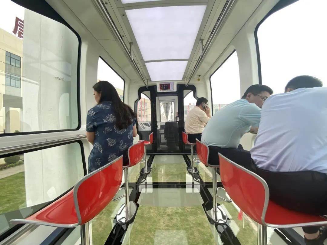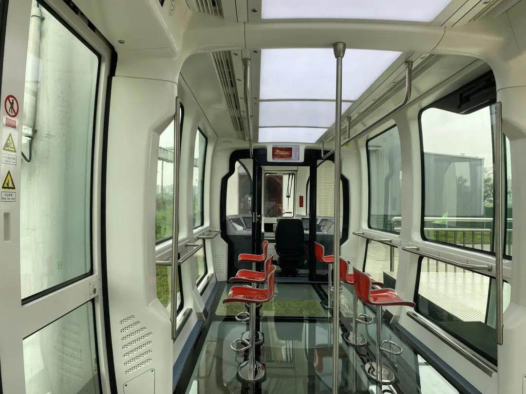 车厢内部,除了顶部由于有转向架、车灯等设备无法做到透明外,剩下的左、右、下部,全部采用透明玻璃设计。作为大邑空铁项目的列车,其270度透明设计,将为市民游客带来更加开阔的视野,便于观光。