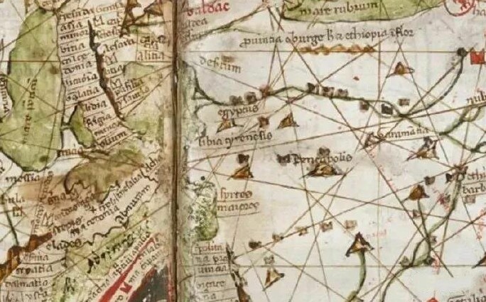 13世纪绘制在单页的羊皮板上的海图。此为现存较早的与埃及地中海有关的海陆图,约绘制于1276年前后。(图中白色为陆地,绿色为地中海,绿色线即尼罗河。)