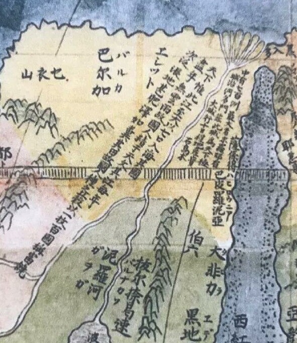 这是17世纪的1601年前后欧洲天主教士利玛窦绘制的《坤宇万国全图》的尼罗河部分。此图作者是利玛窦和李之藻。此图中关于埃及及尼罗河的记述如下: