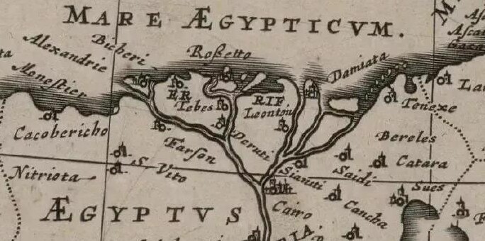 这是1635年布劳Willem Janszoon Blaeu(西元1571‒1638)在阿姆斯特丹绘制的奥斯曼土耳其地图中的尼罗河河口部分。绘图人是丹麦著名天文学家第谷·布拉赫(Tycho Brahe)的学生。