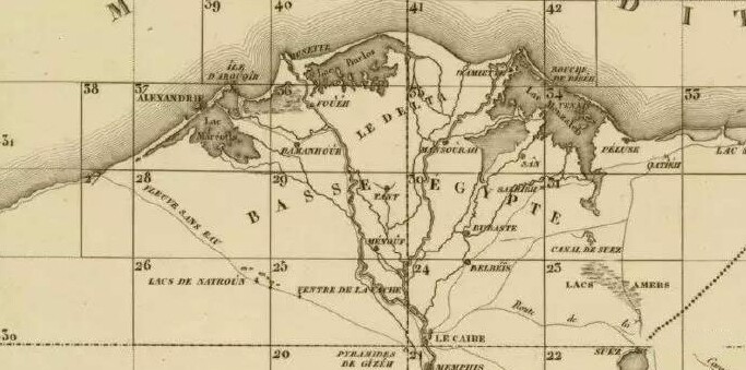 此图出自拿破仑《埃及记述》中关于尼罗河三角洲的地图,此图名:埃及地图集及部分边境地区(板块)(Atlas of Egypt and Parts of Bordering Lands(Plates)),绘制于1798——1801年。