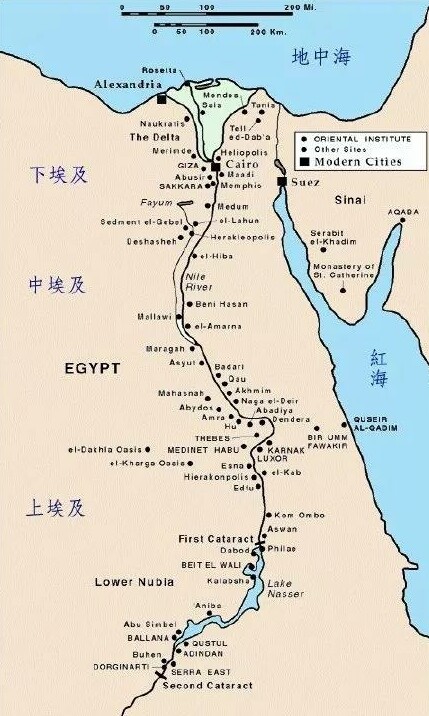 此为埃及的现代地图。这就是现在的地貌,尼罗河口分散的小块岛屿已经联结为陆地。亚历山大港(Alexandria),罗塞塔(Rosetta),开罗都在绿洲陆地上。