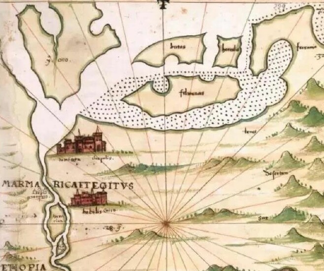 从图上可以看出,当时尼罗河三角洲还没形成,只有一些沙洲和岛屿。值得特别注意是,现在埃及的首都开罗,Cairo,但在这时的地图上,标记的是Cayzo,而Cay是岛、礁石的意思,说明了开罗建城初期的地理特征,开罗是建立在岛屿礁石形成的陆地上的。这个城的历史不会很悠久。