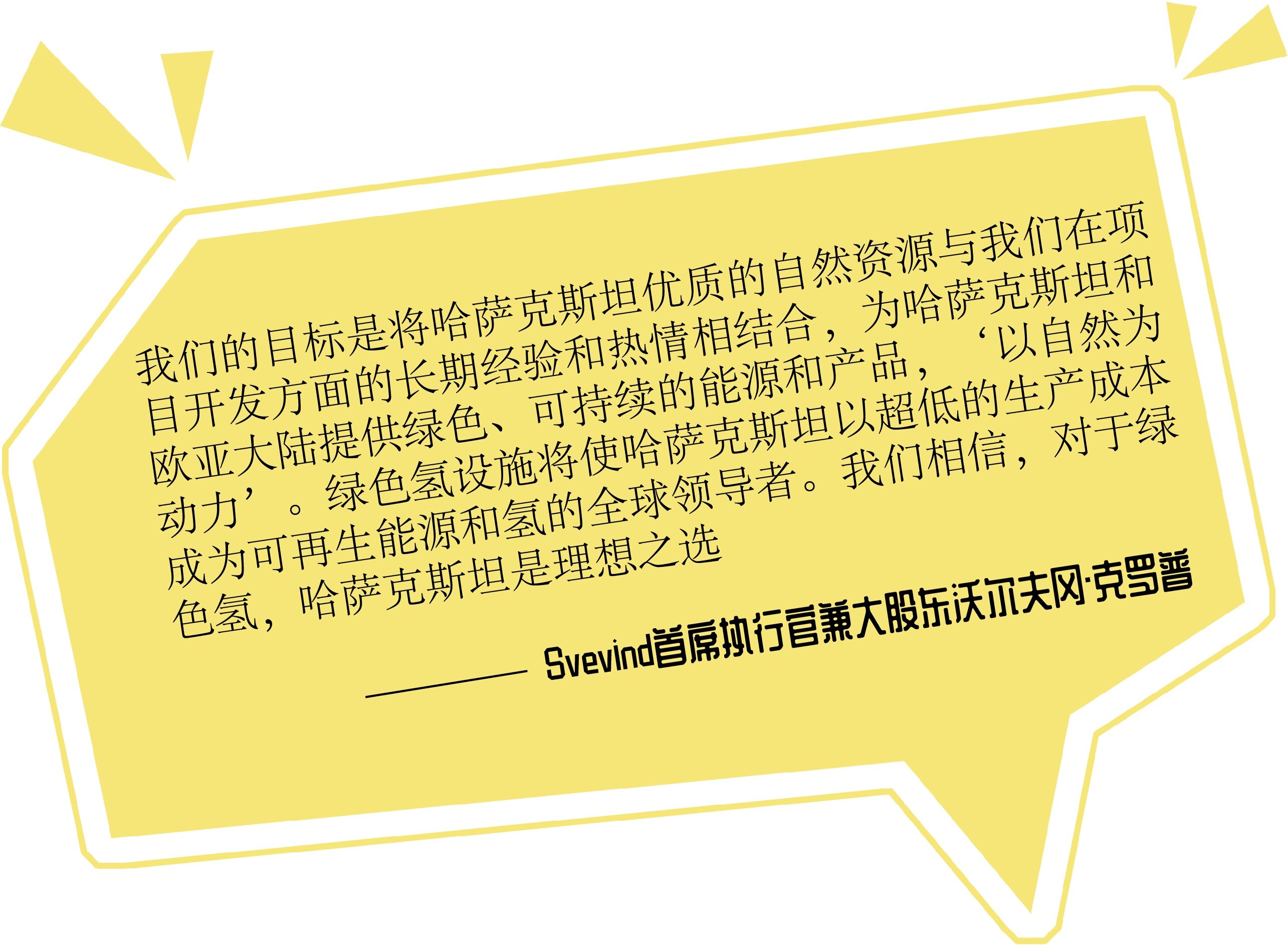 Svevind的首席执行官兼大股东沃尔夫冈·克罗普 (Wolfgang Kropp) 表示:“我们的目标是将哈萨克斯坦优质的自然资源与我们在项目开发方面的长期经验和热情相结合,为哈萨克斯坦和欧亚大陆提供绿色、可持续的能源和产品,‘以自然为动力’。绿色氢设施将使哈萨克斯坦以超低的生产成本成为可再生能源和氢的全球领导者。我们相信,对于绿色氢,哈萨克斯坦是理想之选。”
