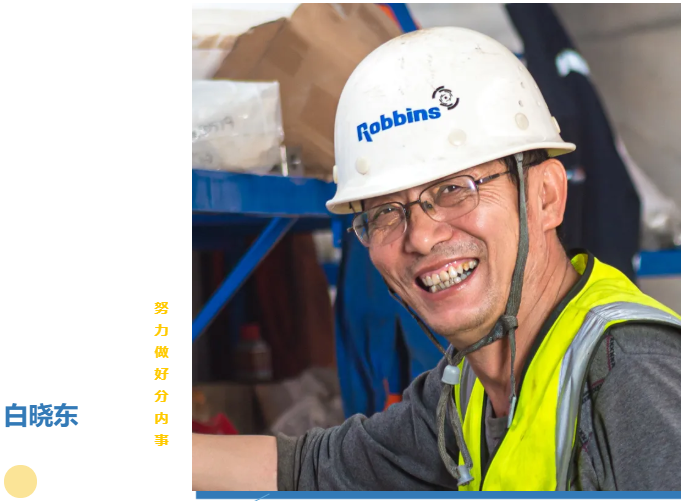白晓东,广州项目现场的其中一位液压技术人员,来自山西偏关。白晓东加入罗宾斯的时候已经是39岁了,从学校毕业分配到当地的发电厂,又遭遇下岗。心灰意冷的他在引黄北干工程干了几年散工后,碰上了人生的伯乐,一位罗宾斯现已退休的老员工,推荐他加入罗宾斯。自从加入了罗宾斯,他深受以人为本的公司文化和精诚团结的团队精神所感染。对工作和生活重新燃起了热情。就这样在罗宾斯一干就是十几年,一直专注搞液压。工作严谨细致,精益求精的白晓东现在已经是罗宾斯一名经验丰富、技术数一数二的液压技术老手。加入罗宾斯以后,他坚持不断自我提升,顺利考取了二级工程师的职称。虽然常年不能在老家陪伴孩子,但因为他对工作重新找到了方向和希望,一直深深地以身教的方式激励着他的孩子成长。他的两个孩子也因此成功考入了北大和大连海事大学。