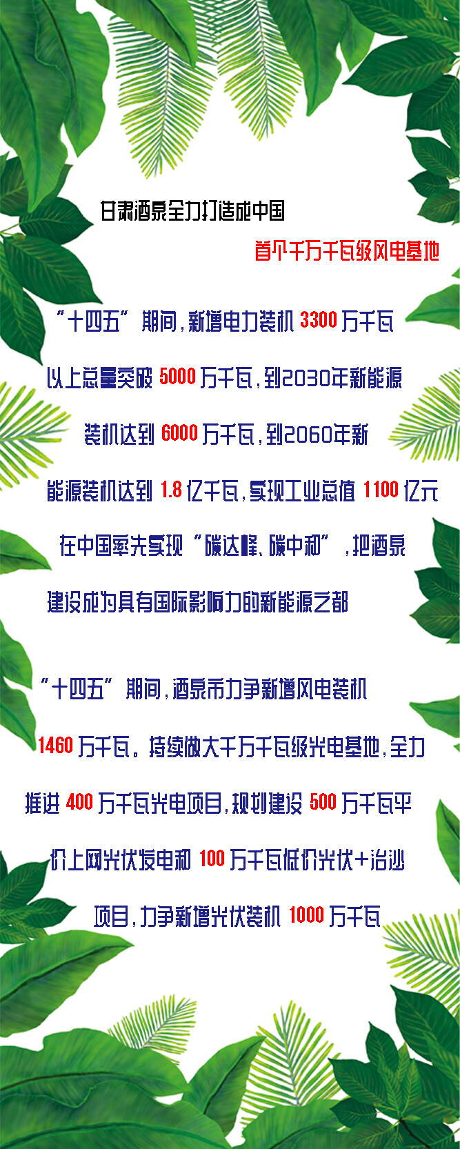 综合分析“双碳”总体目标、酒泉新能源所占份额,酒泉市初步确定了当前和今后一个时期的发展目标:“十四五”期间,新增电力装机3300万千瓦以上,总量突破5000万千瓦,到2030年新能源装机达到6000万千瓦,到2060年新能源装机达到1.8亿千瓦,实现工业总值1100亿元,在中国率先实现“碳达峰、碳中和”,把酒泉建设成为具有国际影响力的新能源之都。
