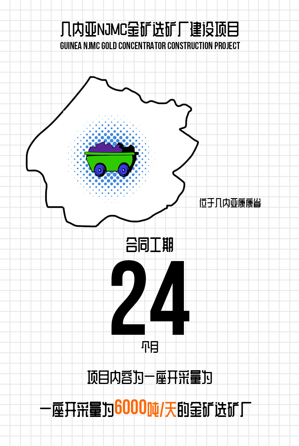 2021年7月5日,中工国际与萨鲁新佳本矿业公司签署了几内亚NJMC金矿选矿厂建设项目商务合同。几内亚NJMC金矿选矿厂建设项目,位于几内亚康康省,合同工期24个月,合同金额为8,512.61万美元,项目内容为一座开采量为6,000吨/天的金矿选矿厂,包括设计和工程建设。