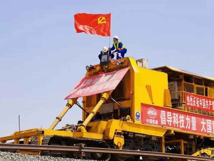 2021年7月1日,伟大的中国共产党百年华诞之际,中铁十四局集团承建的和若铁路巴州段正线铺轨全部完成,工程建设取得阶段性胜利。当最后一对钢轨稳稳地落在轨枕上,现场响起了热烈的掌声、欢呼声,随即,全体党员面向党旗、右手握拳、高举过肩,庄严地重温入党誓词,铿锵誓言响彻在塔克拉玛干沙漠上空。