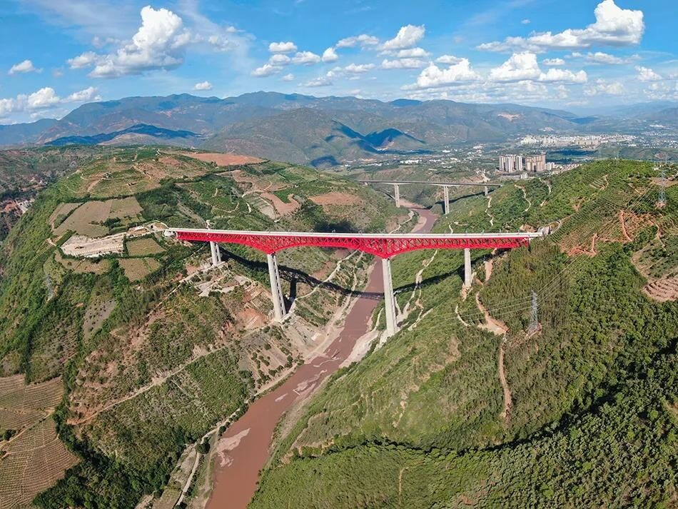 眼前这条红色长龙是中老铁路元江特大桥。51.2米高的电塔在宏大视野中显得格外渺小,数百米长的跨江输电线路更是几不可见。