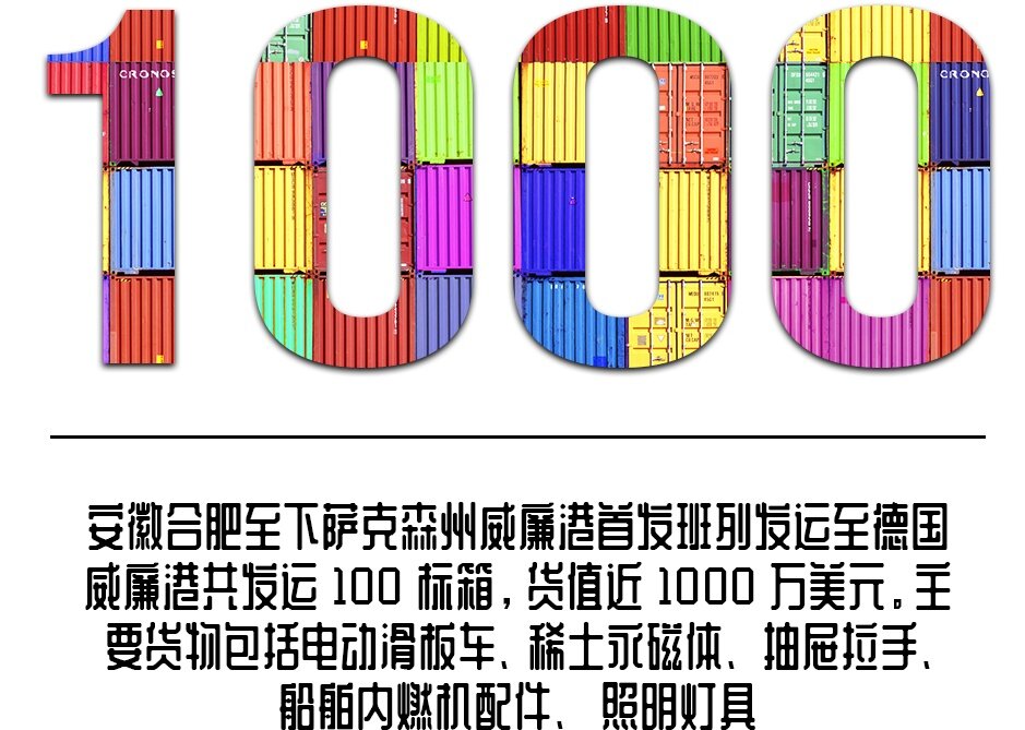 据悉,安徽合肥至下萨克森州威廉港首发班列发运至德国威廉港共发运100标箱,货值近1000万美元。主要货物包括电动滑板车、稀土永磁体、抽屉拉手、船舶内燃机配件、照明灯具。其中安徽本地货物66标箱,主要为白色家电、机械零配件、汽车零配件等。