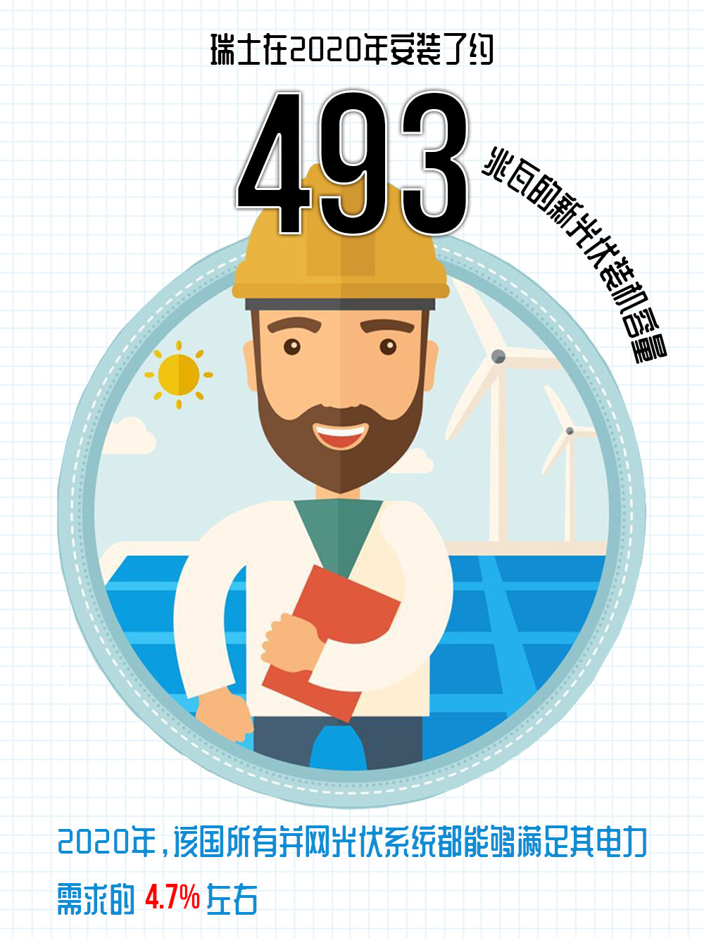 据统计,瑞士在2020年安装了约493兆瓦的新光伏装机容量,这意味着这个阿尔卑斯山国家在年底超过了3吉瓦的门槛(SFOE)。2020年,该国所有并网光伏系统都能够满足其电力需求的4.7%左右。这一份额在2019年仍为3.8%,与2019年相比,2020年的业绩增长了近50%,所有细分市场均录得增长。