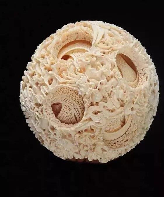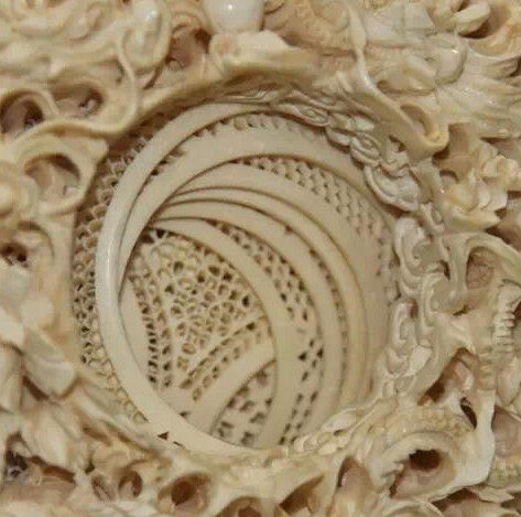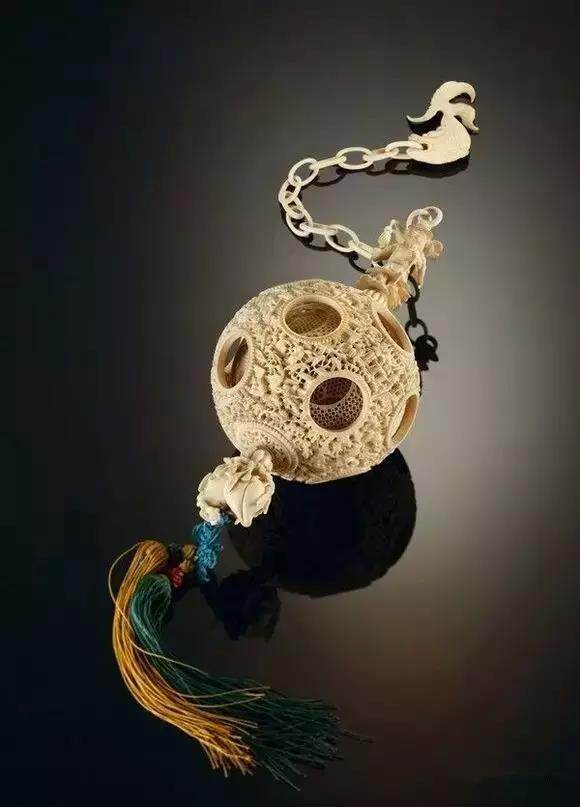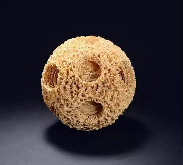象牙套球是中国古代的一种工艺品,它交错重叠,玲珑精致,表面刻镂着各式浮雕花纹。球体从外到里,由大小数层空心球连续套成,外观看来只是一个球体,但层层叠叠套连相含。其中的每个球均能自由转动,且具同一圆心。
