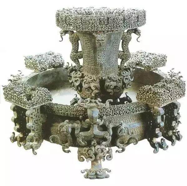 曾侯乙尊盘是春秋战国时期最复杂、最精美的青铜器件,1978年在湖北随州市擂鼓墩曾侯乙墓中出土。全套器物通高42厘米,口径58厘米,重约30公斤。