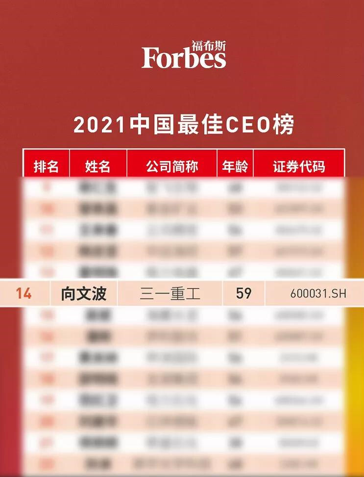 2021年7月15日,福布斯中国发布2021中国最佳CEO榜,50名上市公司CEO上榜。三一重工总裁向文波继去年之后再度入选榜单,位列第14位,较去年名次上升10位,仍然是工程机械行业唯一登榜的CEO。