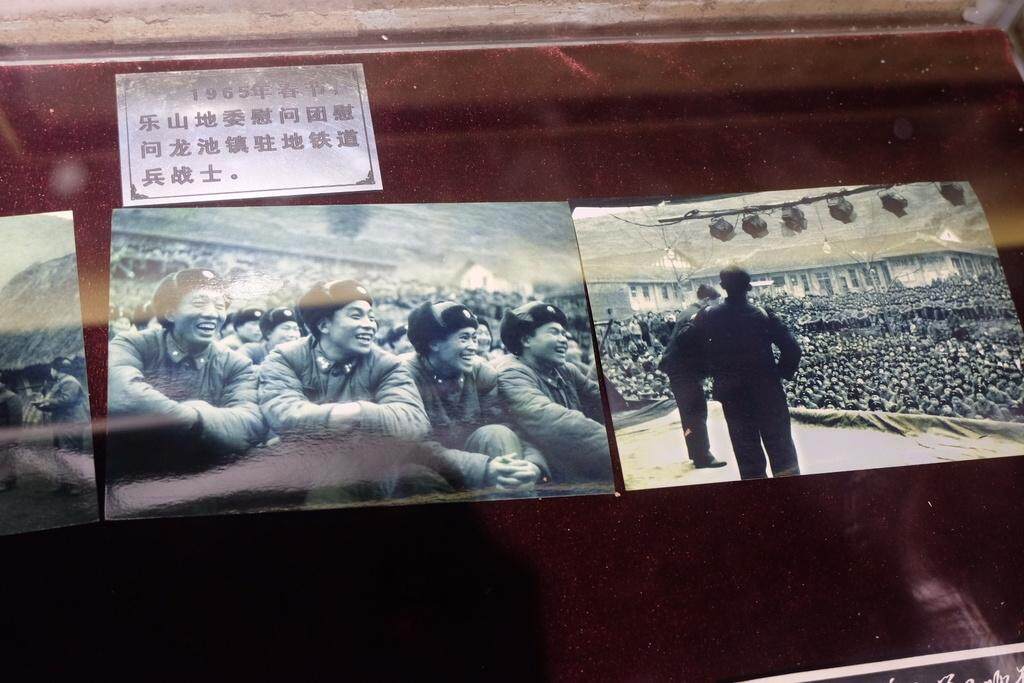 而在另一个玻璃展示柜里,是一群风华正茂的铁道兵大男孩正在看文艺节目的老照片,他们的脸上绽放着阳光的笑容。